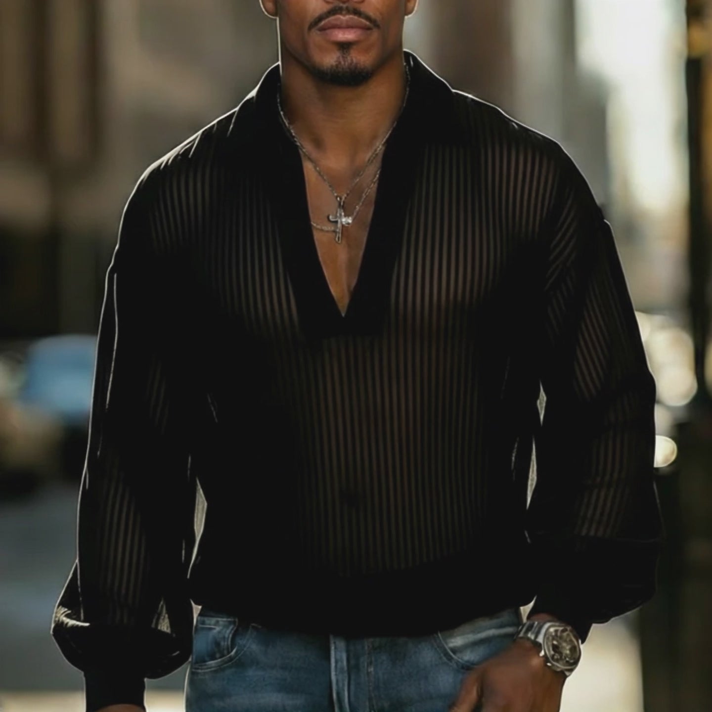 Men's Fashionable Faux Velvet Striped Sheer V-neck Long-sleeved Shirt MTZ1638A7P