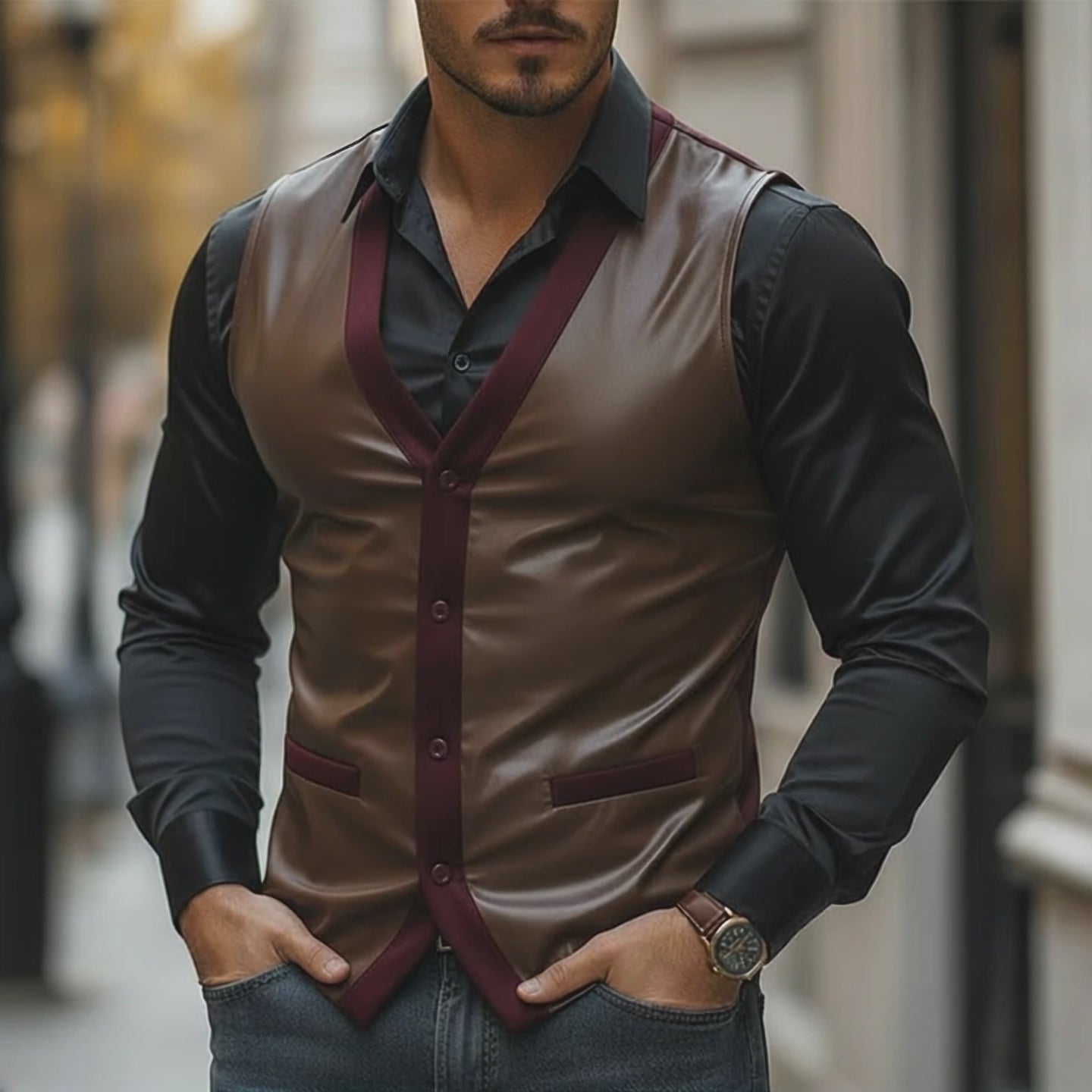 Gilet en cuir à col en V vintage pour homme