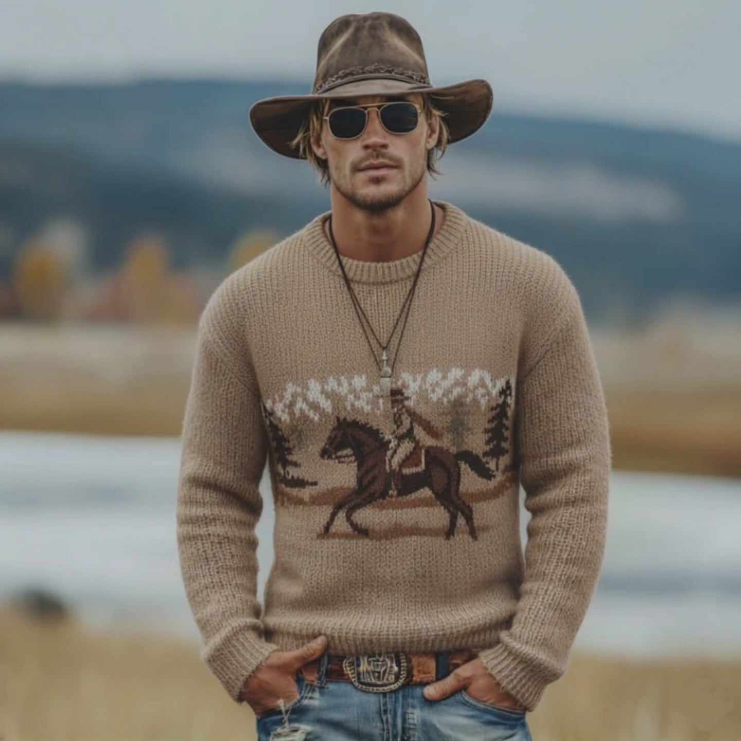 Men's Classic Retro Western Style Jacquard Crew Neck Sweater MTA3029K0K