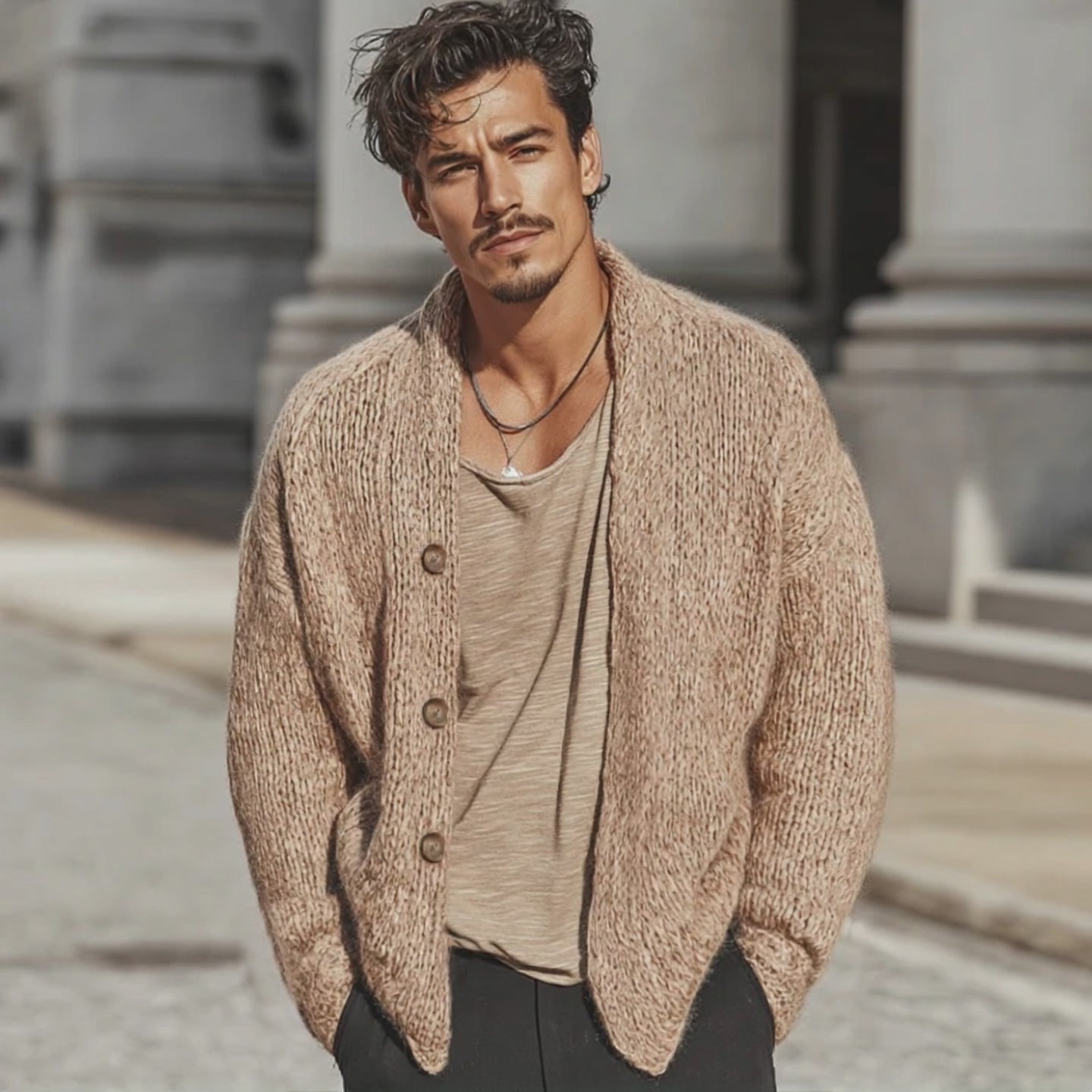 The Men's Casual Khaki Button-up Knit Cardigan is a versatile and stylish addition to any wardrobe. Designed with comfort and fashion in mind, this cardigan offers a cozy knit texture with a classic button-up front, perfect for layering and adding a touch of sophistication to your casual look.