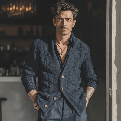 This Men's Classic Cable Knit Jacquard Navy Blue Button-up Cardigan is a timeless piece that effortlessly combines style with comfort. Featuring a refined navy blue hue, this cardigan is designed with intricate cable knit patterns, adding texture and visual appeal. The button-up front adds versatility, making it perfect for layering.