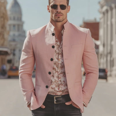 The Men’s Classic Casual Pink Stand-Collar Cotton and Linen Jacket offers a stylish, versatile option for smart-casual to casual ensembles. Its cotton-linen blend, stand-collar silhouette, and thoughtfully designed details make it a dependable wardrobe staple for layering and everydaywear across seasons.
