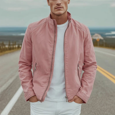 Men's Classic Casual Stand Collar Pink Cotton Blend Zip-Up Jacket