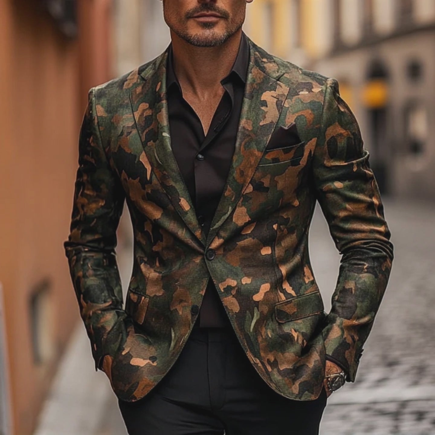 Pair this Retro Camouflage Print Blazer with a simple black or white shirt and your favorite jeans for a laid-back yet stylish look. For a more sophisticated ensemble, consider wearing it over a turtleneck sweater and tailored trousers. Complete the outfit with leather boots or sneakers to balance the edgy print.
