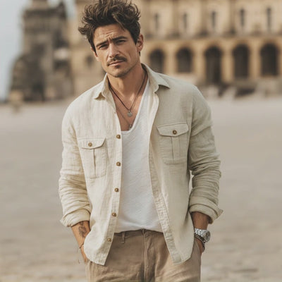 The Men's Vintage Beige Cotton and Linen Long-sleeved Shirt is a timeless piece designed for those who appreciate classic elegance and comfort. Crafted from a blend of cotton and linen, this shirt embodies both breathability and durability, making it suitable for various occasions throughout the year.