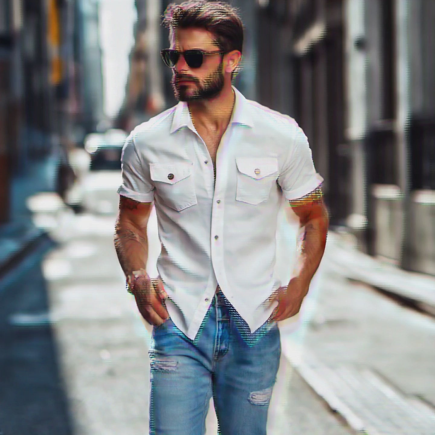 【Spedizione in 24 ore】Camicia da uomo a maniche corte con doppia tasca sul petto, tinta unita, plissettata, 32920501Y