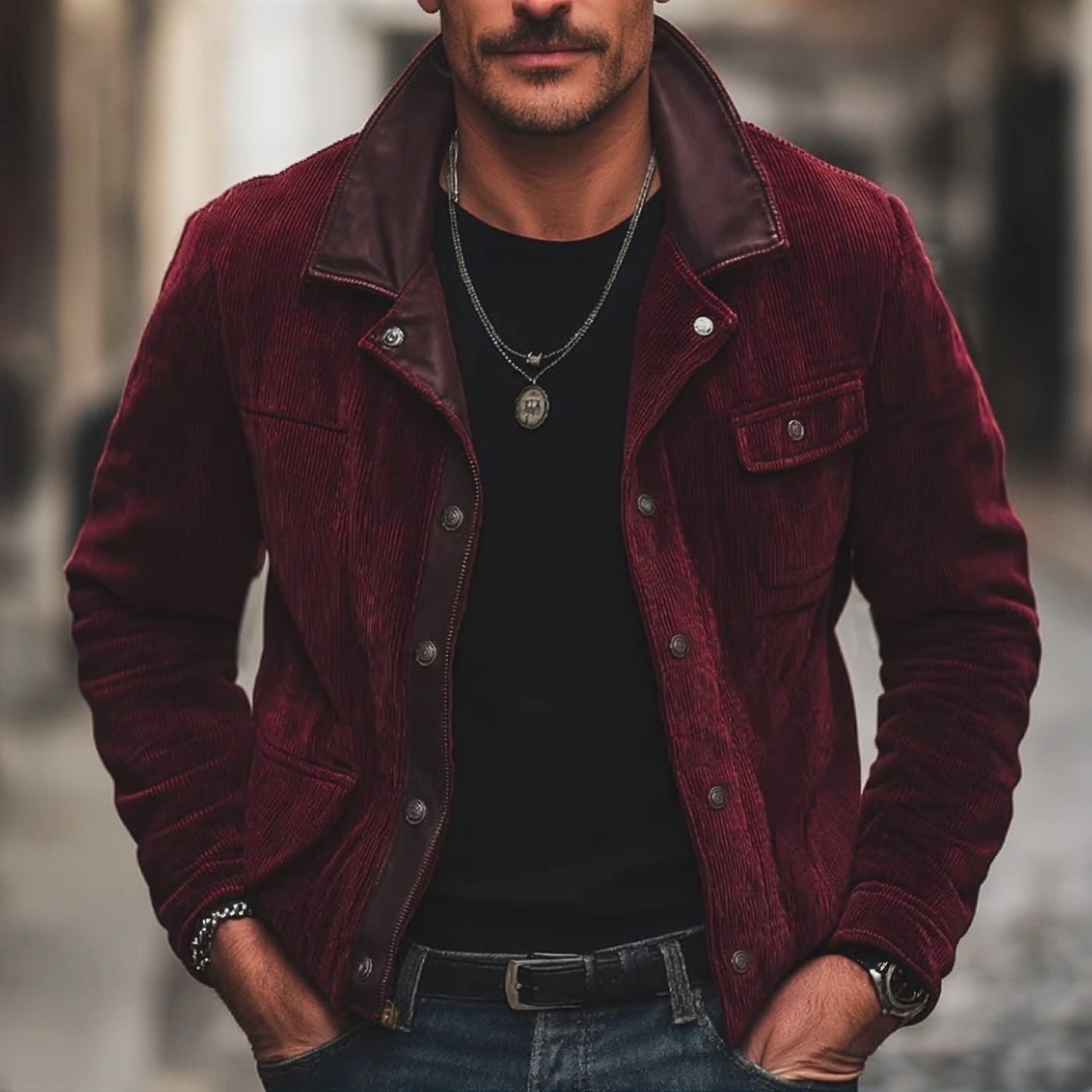Men's Retro Dark Red Corduroy And PU Leather Snap-Button Jacket MTA1384K8U