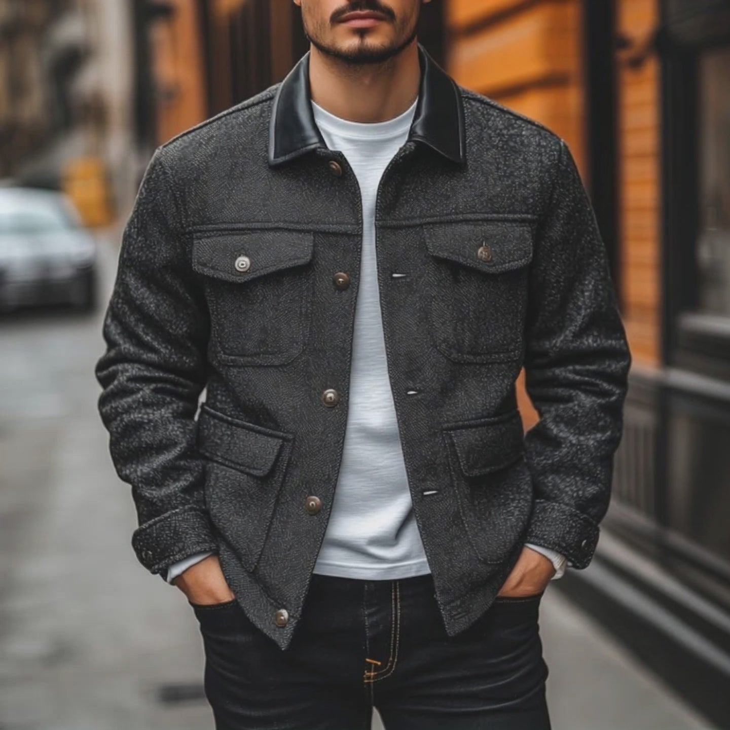 Men's Vintage Herringbone Blend PU Lapel Patchwork Single-breasted Multi-pocket Work Jacket MTA0695H5M