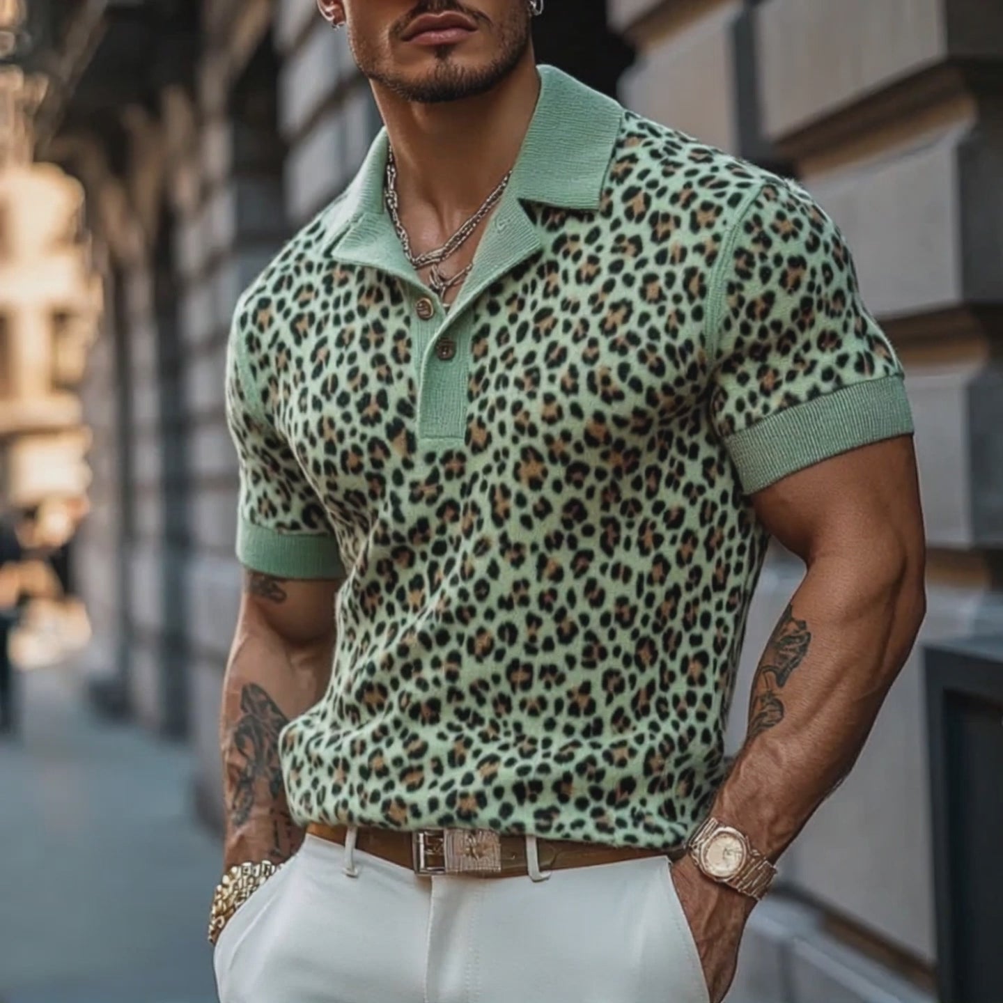 Men's Fashion Leopard Print Knitted Short-sleeved Polo Shirt MTA0754F7Y