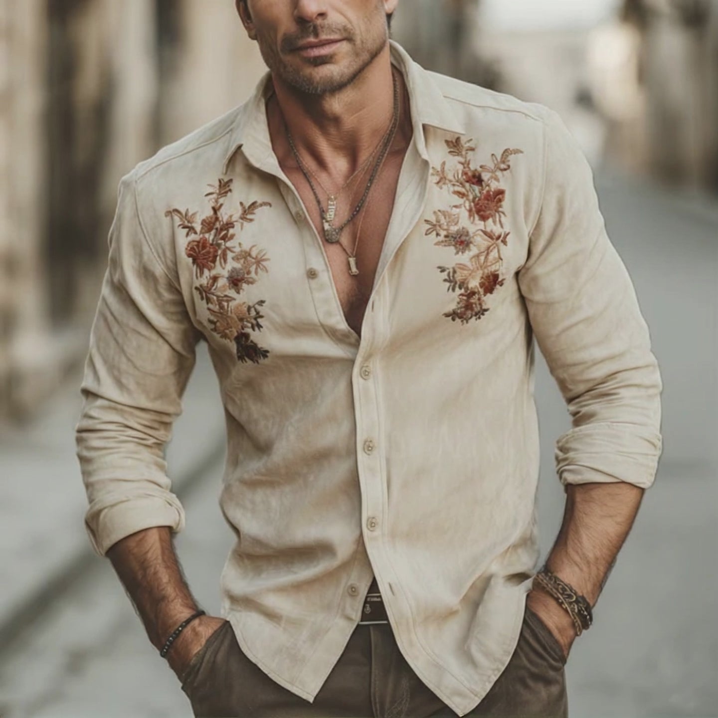 Men's Retro Beige Floral Embroidered Faux Suede Long-Sleeved Shirt MTZ2120A2U