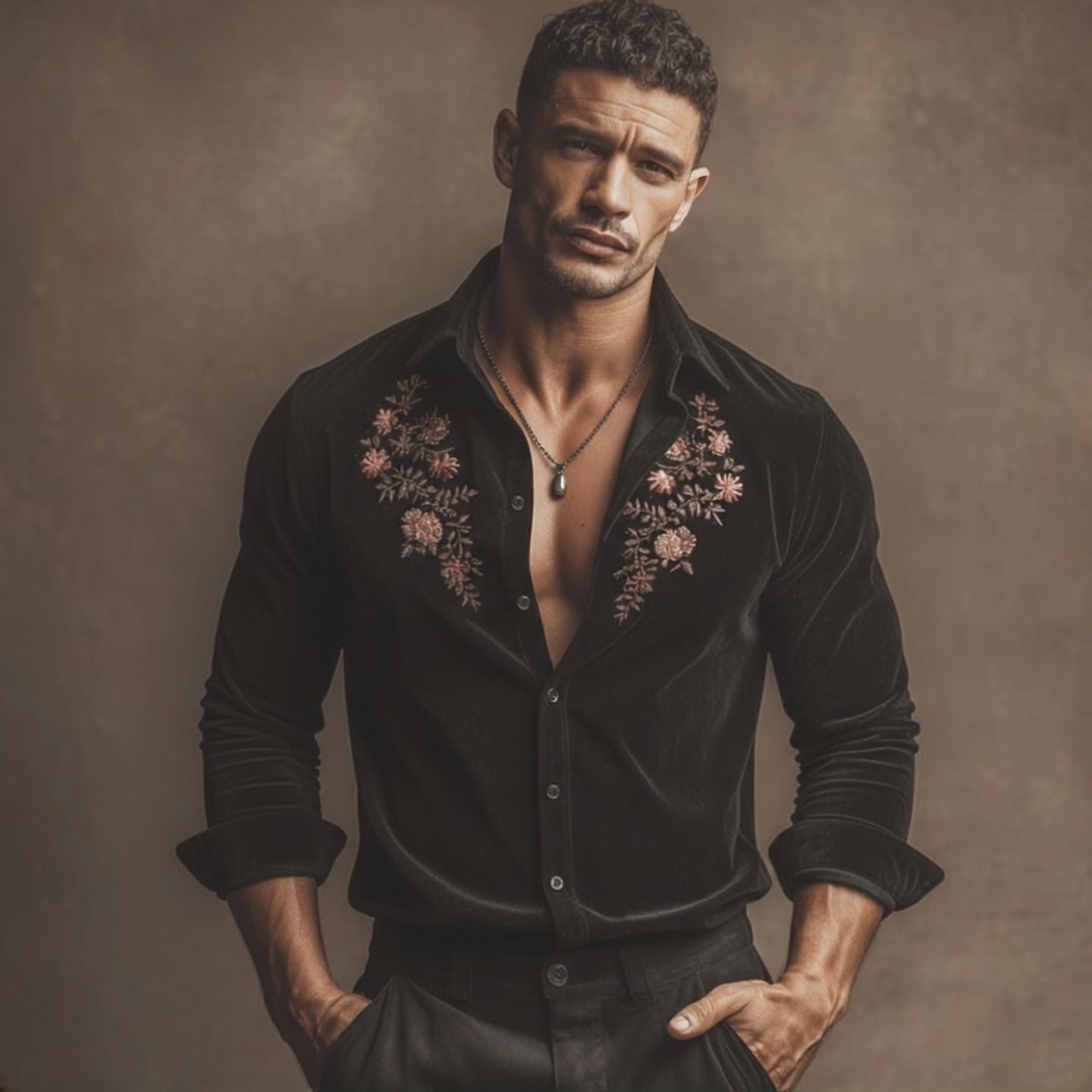Men's Elegant Black Faux Suede Floral Embroidery Long-sleeved Shirt MTZ2259A1U