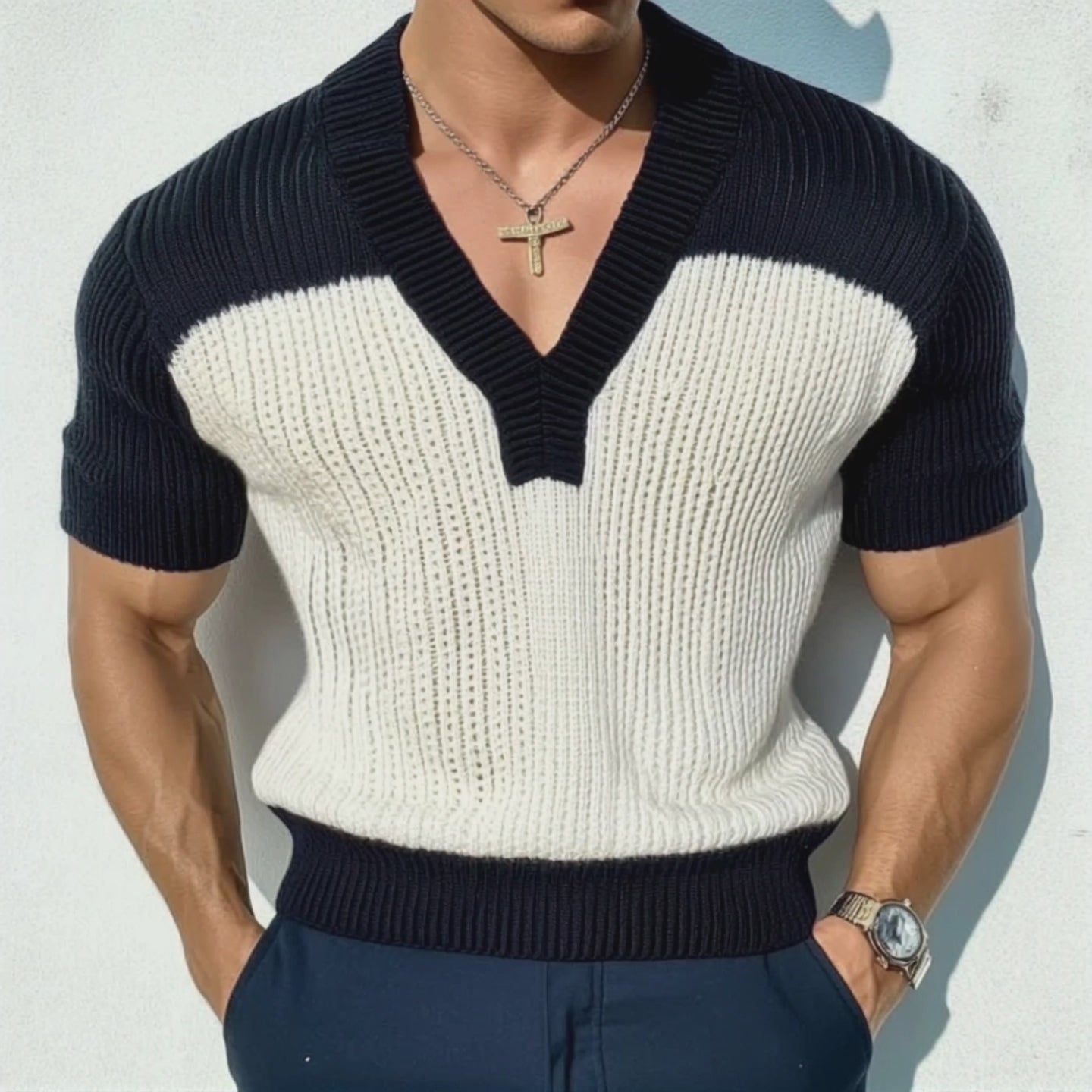 Men's Casual Contrast Color V-Neck Slim Fit Knitted Short Sleeve Sweater T-Shirt MTA1727C6M