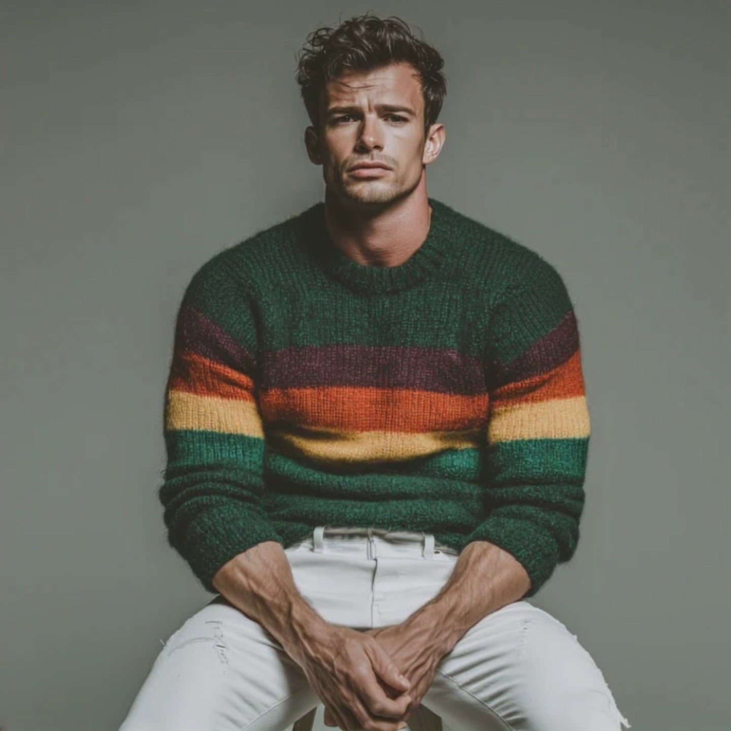 Men's Classic Casual Christmas Green Crew Neck Horizontal Striped Sweater MTA2961I7K