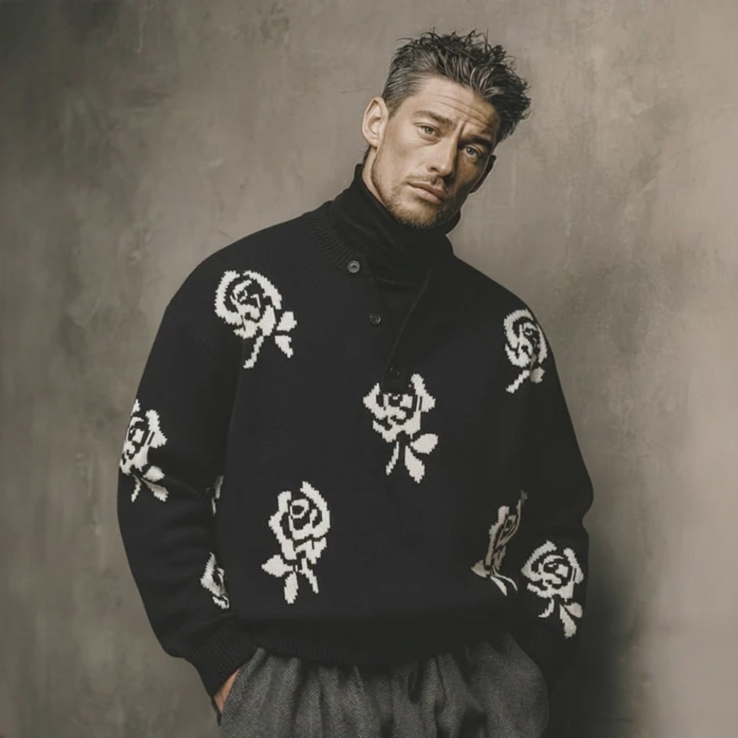 Men's Classic Old-money Style Henley Collar Rose Jacquard Loose Sweater MTA0642K3K