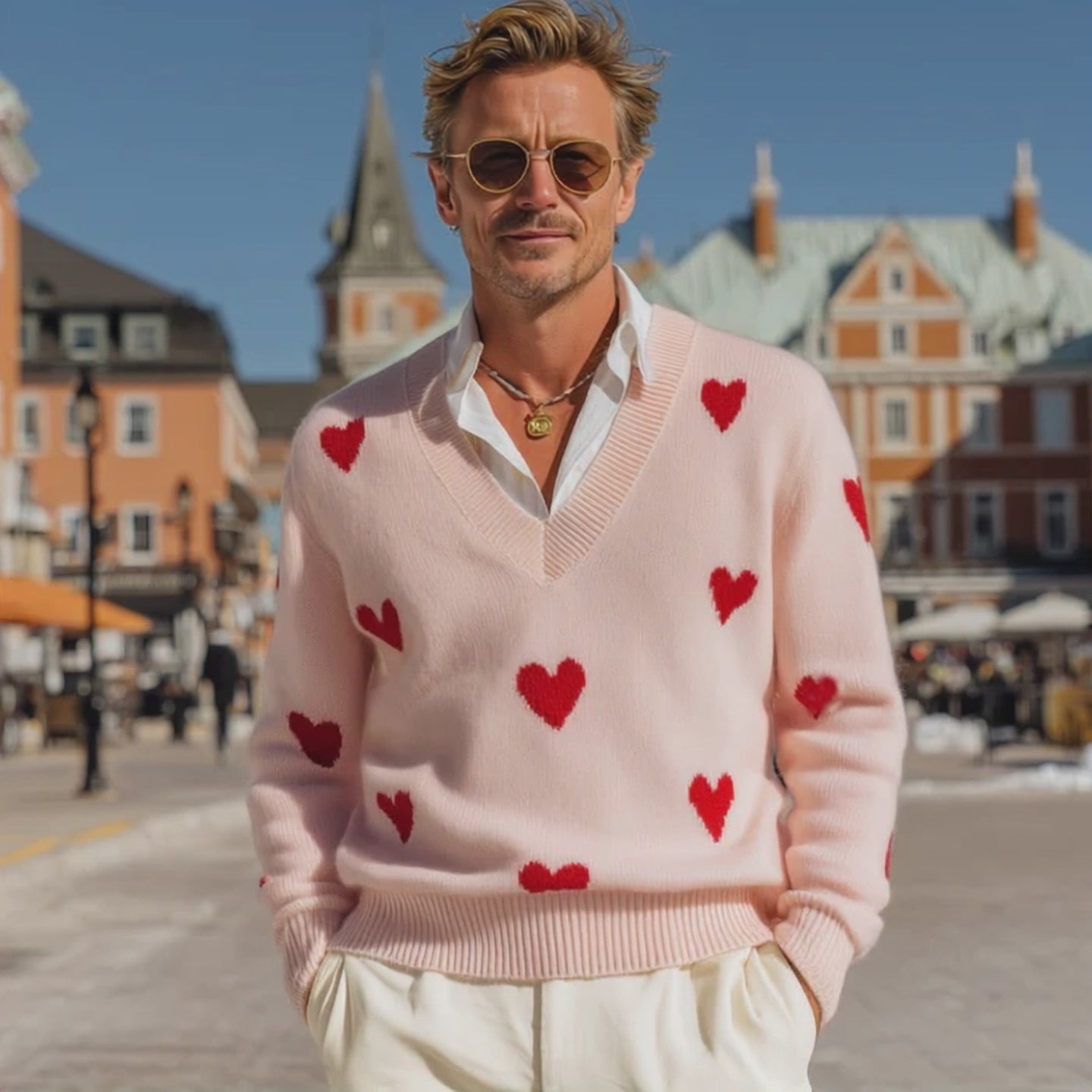 Men's Casual V-Neck Heart Pattern Pink Pullover Sweater