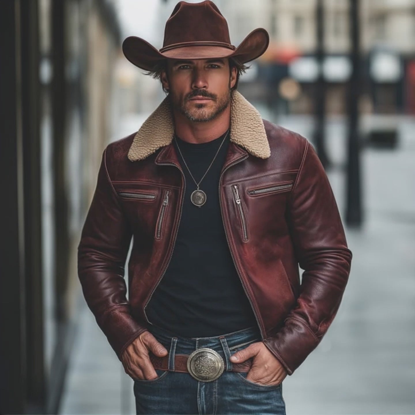 The Men's Classic Burgundy Patchwork Lambswool Collar Zipper PU Leather Jacket is a stylish and sophisticated piece that combines classic design with modern flair. Crafted from high-quality PU leather, this jacket is adorned with a luxurious lambswool collar that adds a touch of elegance and warmth.