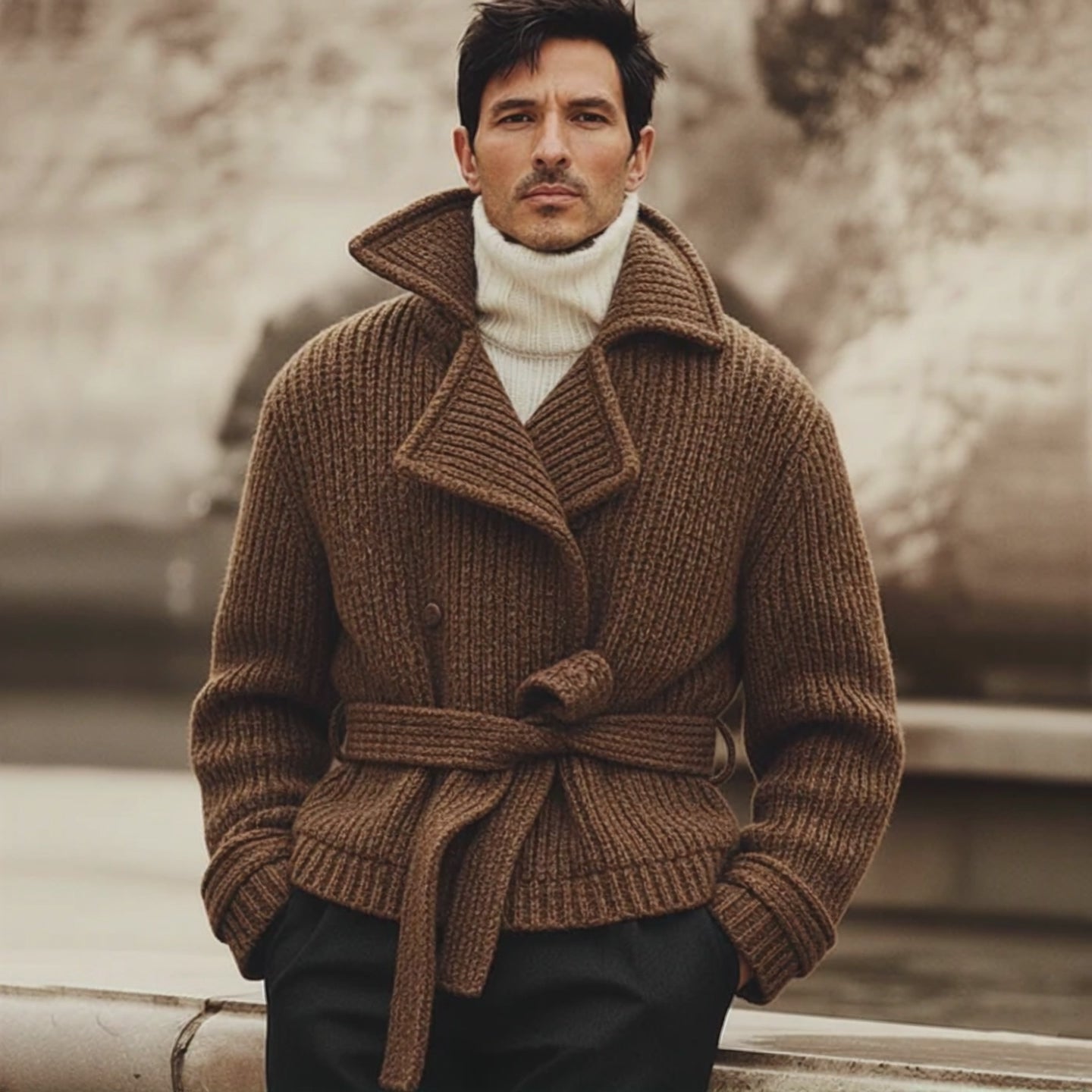 Men's Classic Notched Lapel Double-breasted Belted Knit Jacket