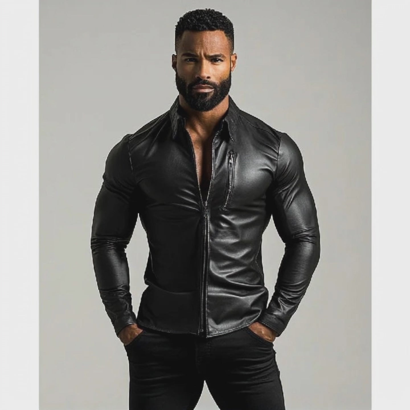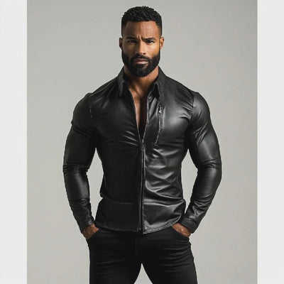 IL Camicia in pelle a maniche lunghe con risvolto e cerniera slim fit da uomo è un capo audace ed elegante che fonde perfettamente la struttura di una camicia con il fascino audace della pelle. Caratterizzata da una vestibilità slim, chiusura con cerniera e un moderno colletto a revers, questa camicia è perfetta per fare colpo in occasioni casual o semi-formali.