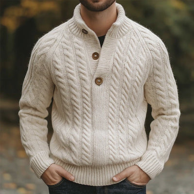 The Men's Retro Casual Cable Knit Button-Up Collar Pullover Sweater, is a timeless wardrobe staple that embodies a blend of vintage aesthetics and modern comfort. Crafted with precision, this sweater is characterized by its intricate cable knit pattern, delivering both style and warmth.