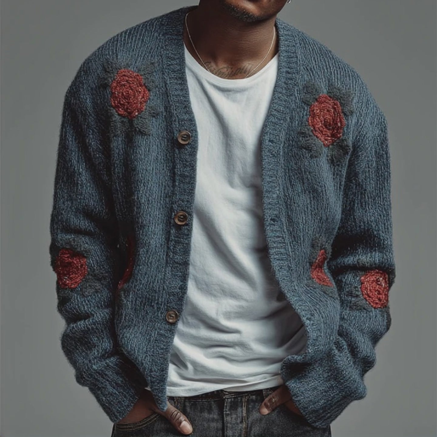 This cardigan is an ideal choice for men who want to elevate their wardrobe with a classic piece that offers both comfort and style. Its intricate floral embroidery details and retro-inspired design make it a standout in any outfit.