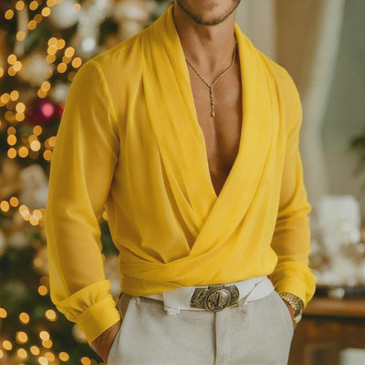 Men's Retro Casual Solid Color Chiffon V-Neck Pullover Long-Sleeve Shirt is a must-have for anyone seeking comfort without compromising on style. Its timeless design, combined with modern touches, makes it a versatile piece that seamlessly transitions from casual to smart casual settings.