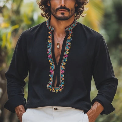 The Men's Spring Fashion Embroidered U-neck Faux Suede Long-sleeved Shirt is a stylish addition to any wardrobe, perfect for the modern man seeking both comfort and flair. This shirt uniquely combines traditional embroidery with contemporary design to create a standout look.