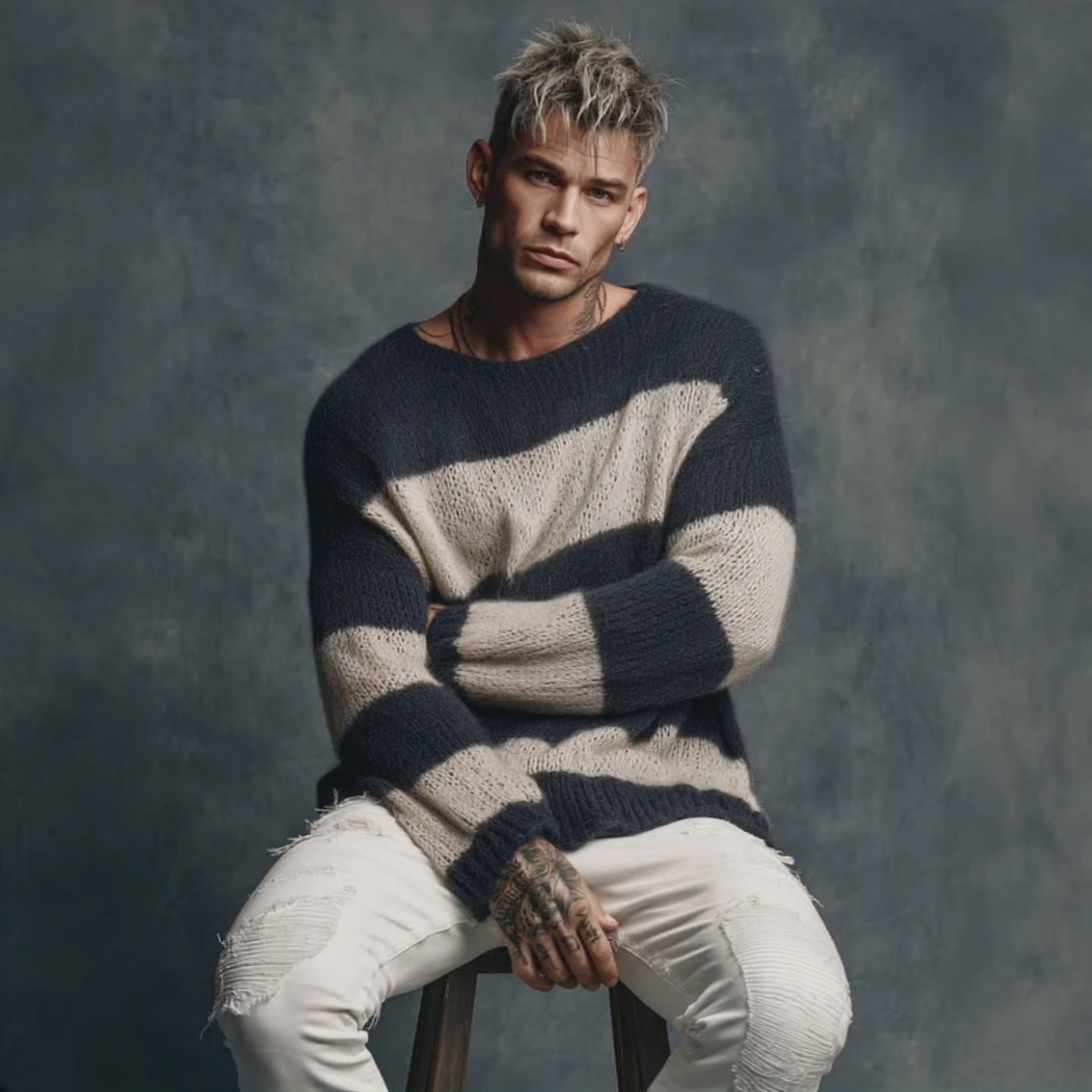 Uformelt V-hals, fargeblokk stripete løsstrikkede genser for menn 46504810M