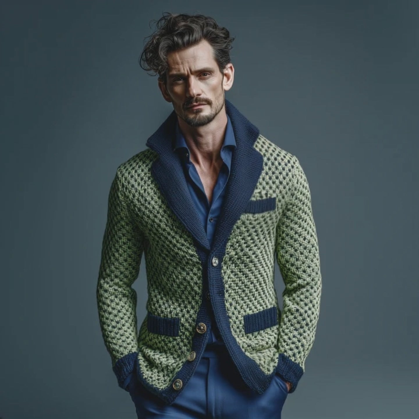Product Name:Men's Classic Casual Lapel Green And Navy Blue Slim Jacquard Knit Cardigan