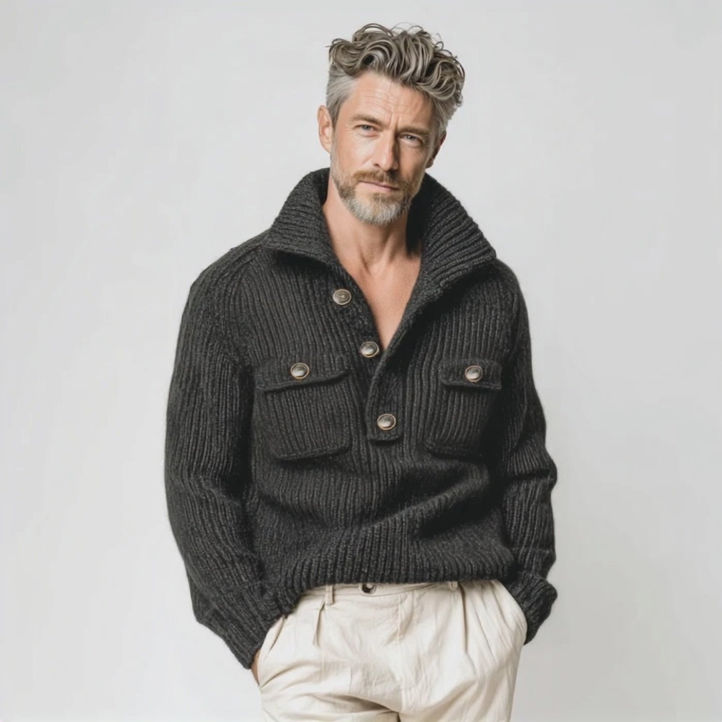 Men's Classic Casual Stand Collar Button Pocket Loose Sweater MTA2607I5K