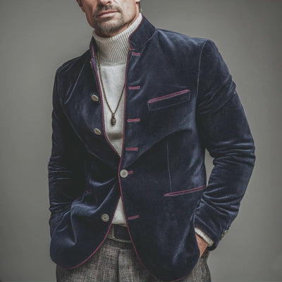 This Men's Retro Business Stand Collar Jacket combines a vintage flair with modern elegance. Crafted from high-quality velvet, this jacket showcases exquisite embroidered lines that add a touch of sophistication to your ensemble. The slim fit design accentuates your silhouette, offering a sharp and polished look for any formal occasion.