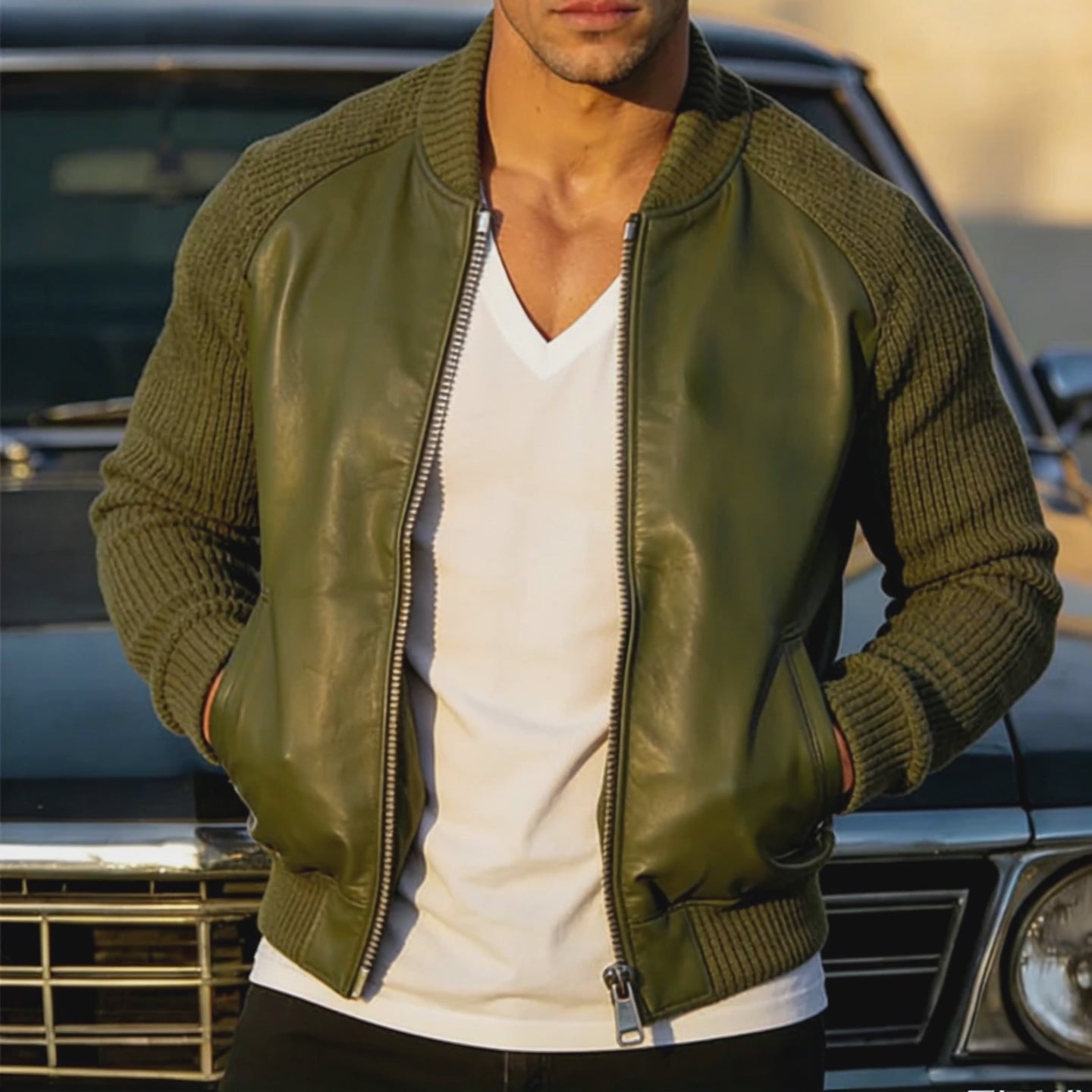 Men's Retro Casual Knitted Patchwork PU Zipper Collarless Jacket MTA1678L4TO