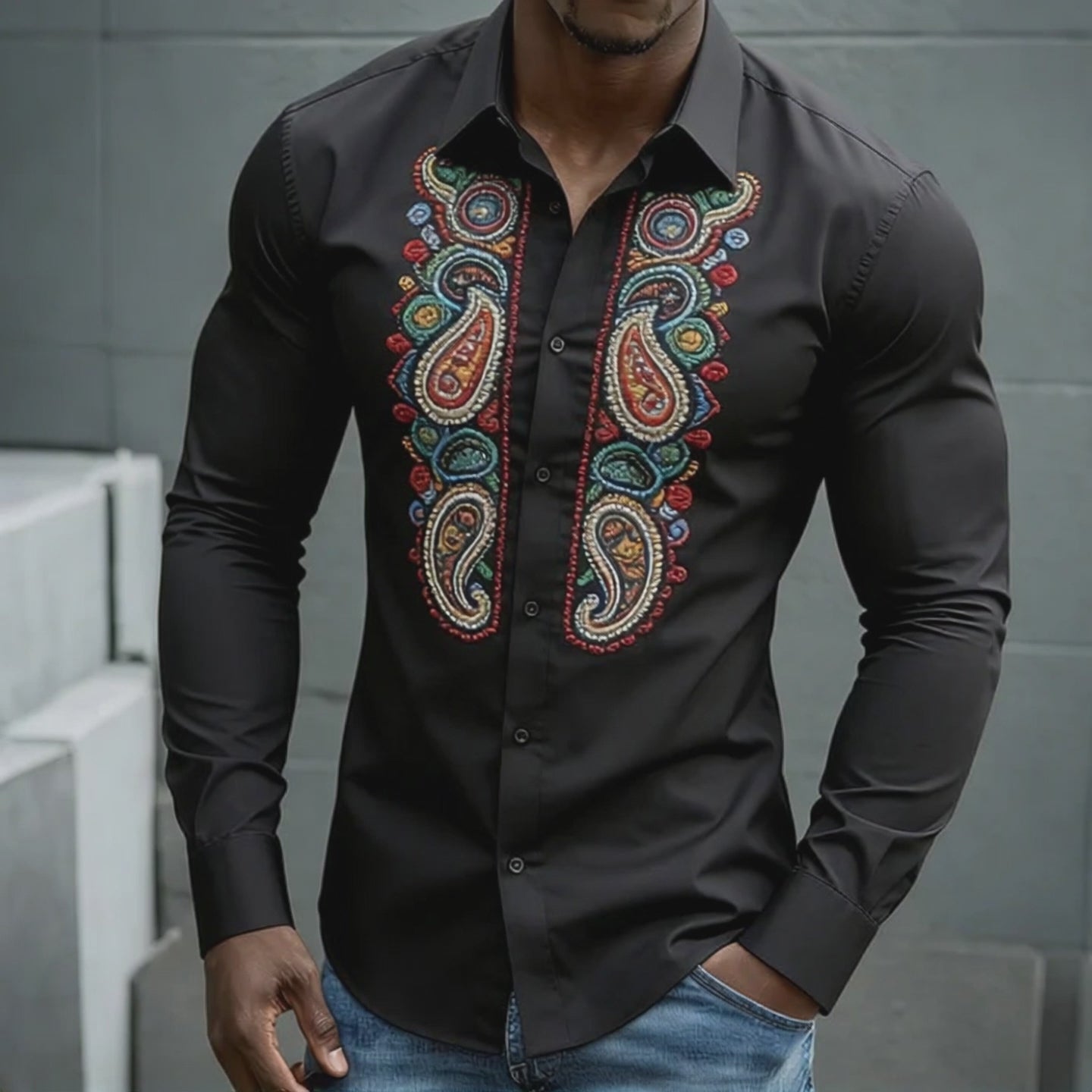 The Men's Retro Casual Perris Embroidered Cotton Lapel Long Sleeved Shirt is an excellent addition to any wardrobe, offering versatility and a touch of elegance. Whether dressing up for an event or down for casual outings, this shirt will make a statement.
