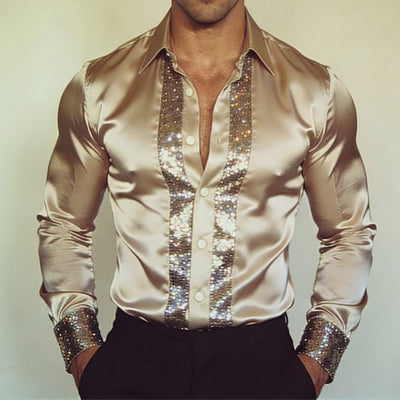 This distinctive men's shirt blends retro style with modern flair, featuring a luxurious satin fabric accented by sequin patchwork. The lapel collar and long-sleeves exude sophistication, making this shirt an outstanding piece for any wardrobe.