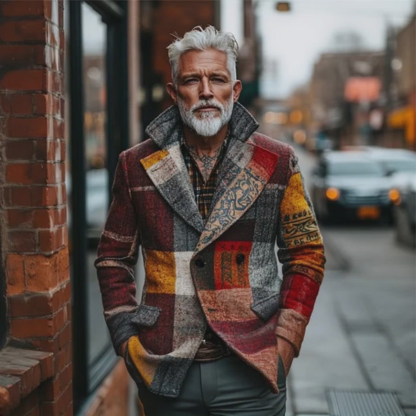 Retro uformelt tweed pledd jakke med trykt etnisk stil for menn 78526897TO