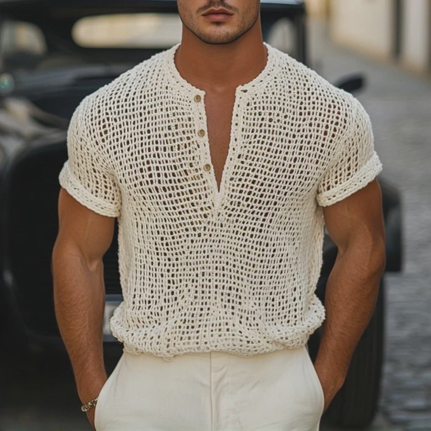 Denne herre-T-skjorten med ensfarget strikkede, hule Henley-krage og korte ermer kombinerer klassiske designelementer med moderne detaljer. Den komfortable passformen og det subtile, hule mønsteret gjør den perfekt for uformelle utflukter, lag-på-lag-på-lag-klær eller avslappende helger, slik at du ser stilig ut samtidig som du føler deg komfortabel.
