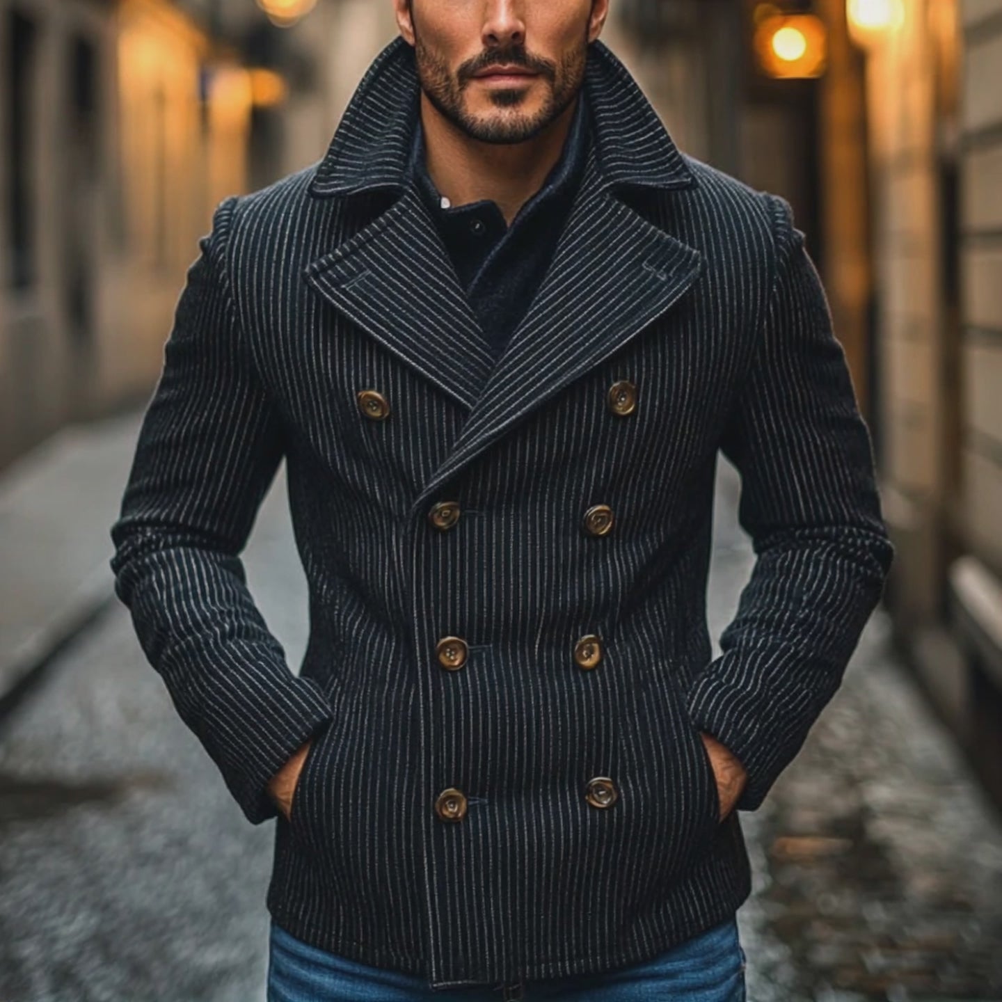 The Men's Striped Casual Double Breasted Lapel Jacket,is the epitome of modern sophistication blended with timeless elegance. This jacket features a striking striped pattern that adds a subtle yet bold statement to your wardrobe. It comes designed with a double-breasted front closure and a classic lapel, making it suitable for various occasions—whether formal or casual.