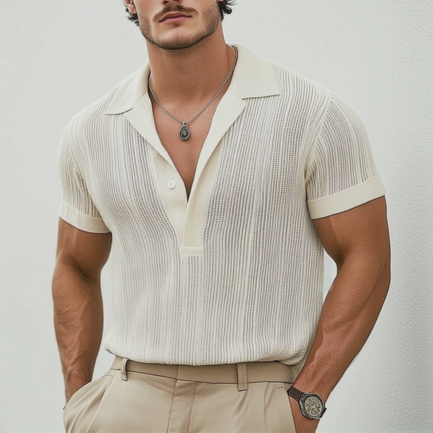 Hold deg kjølig og stilig i sommer med vår klassiske strikkede sommer-T-skjorte med pustende V-hals for menn. Denne T-skjorten er designet for å kombinere funksjonalitet med tidløs stil, og er laget av pustende strikkestoff, noe som sikrer komfort selv på de varmeste dagene. Den klassiske polohalsdesignen gir et snev av raffinement, noe som gjør den til et allsidig valg for både uformelle og smart-casual anledninger.