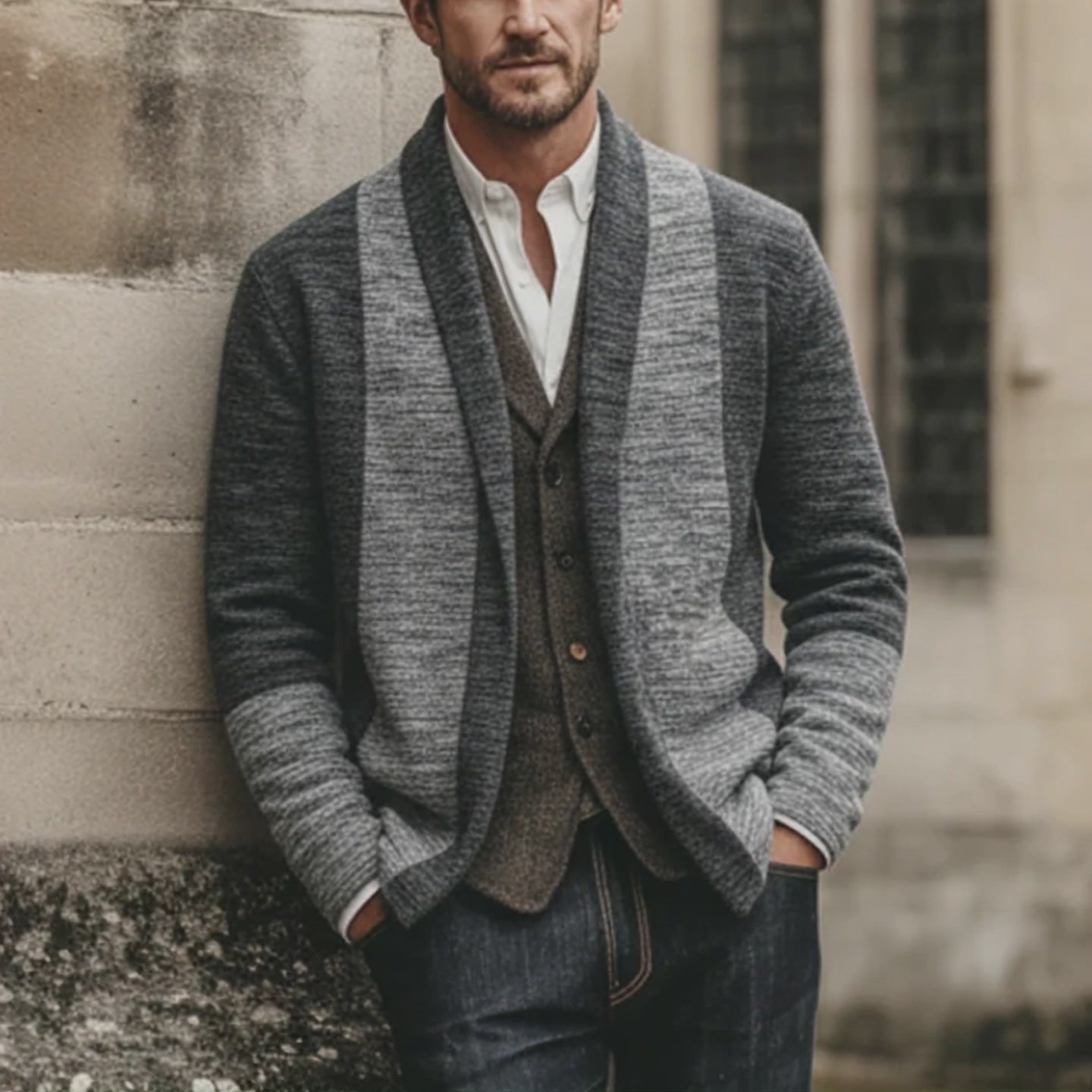 Pair this cardigan with dark denim jeans and leather boots for a classic and refined look. Alternatively, match it with tailored trousers and a crisp white shirt for a sophisticated, office-ready ensemble. The cardigan's neutral tones allow it to blend seamlessly with various color palettes.