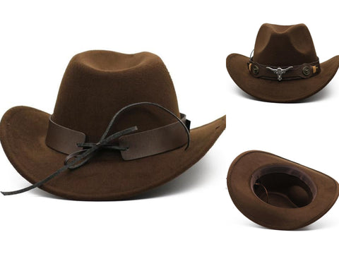 Western cowboyen er utstyrt med klassisk luebånd i kunstskinn for den prefekte etterbehandlingen. Oksehodemønsteret på hattebåndet viser en vintage stil. Denne cowboyen kan brukes hvor som helst.
