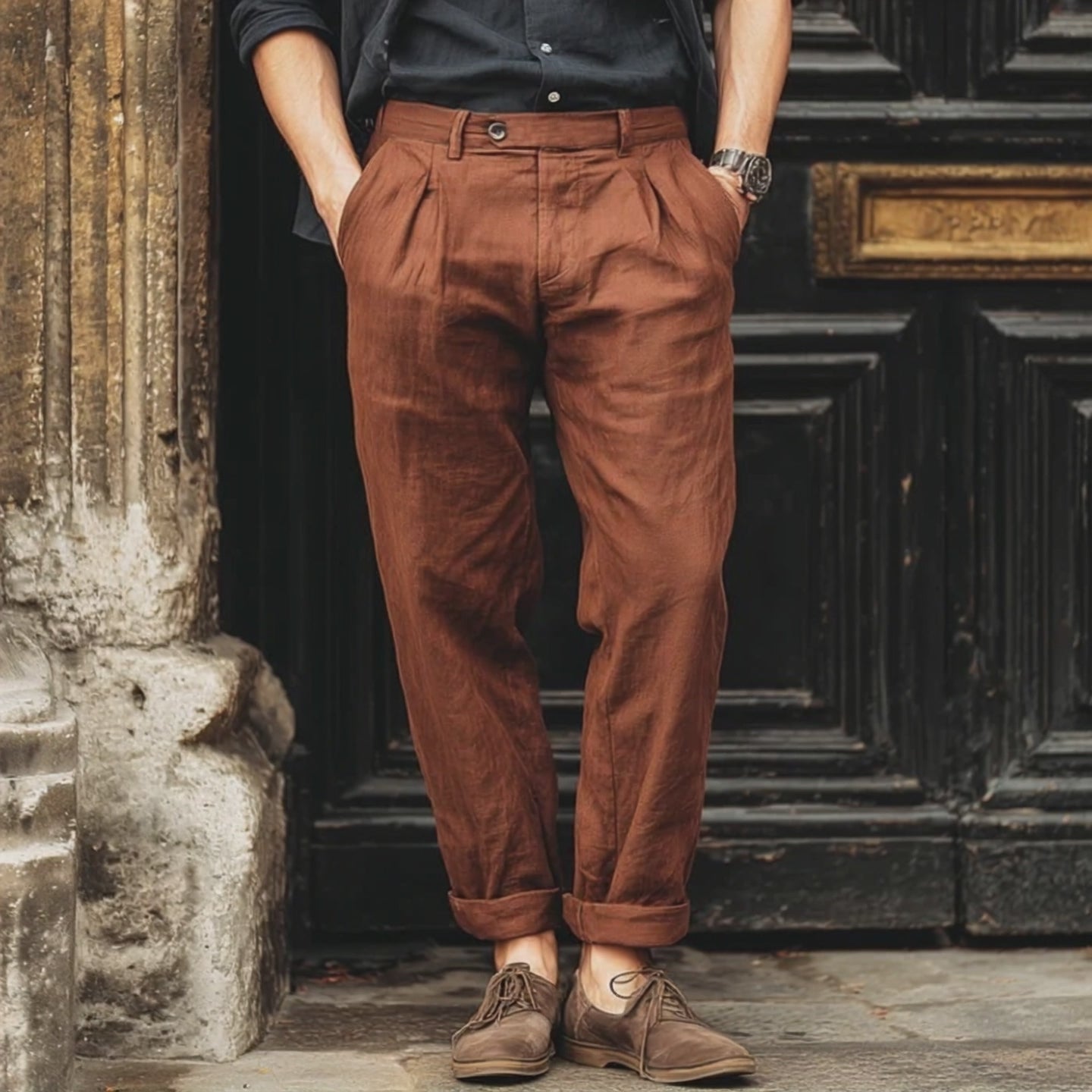 These pants pair excellently with a crisp white shirt and a tailored blazer for a classic business look. For a more relaxed yet refined outfit, consider wearing them with a fitted knit sweater and loafers. Accessorize with a sleek belt and a watch to complete the ensemble.