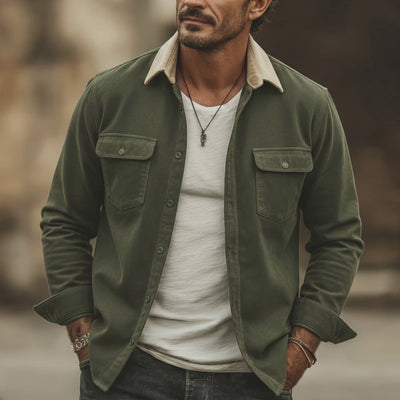 Men's Classic Army Green Faux Suede Colorblock Collar Long-sleeved Shirt MTZ2889A5U