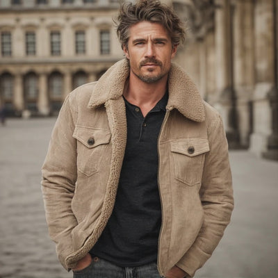Description: A quintessential addition to every man’s winter wardrobe, this camel corduroy jacket combines classic style with modern functionality. The rich, warm color of the camel fabric is perfectly complemented by the luxurious shearling lining, ensuring both comfort and sophistication.
