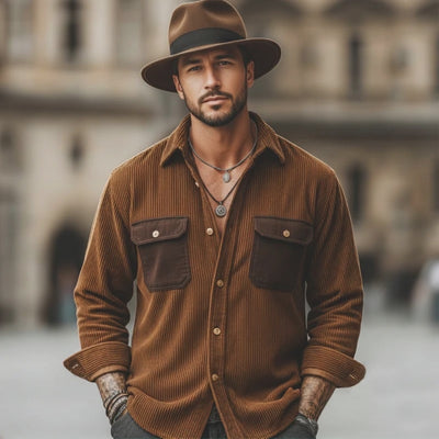 Men's Classic Corduroy Color-Blocked Pocket Long-Sleeve Shirt MTA2006L7U