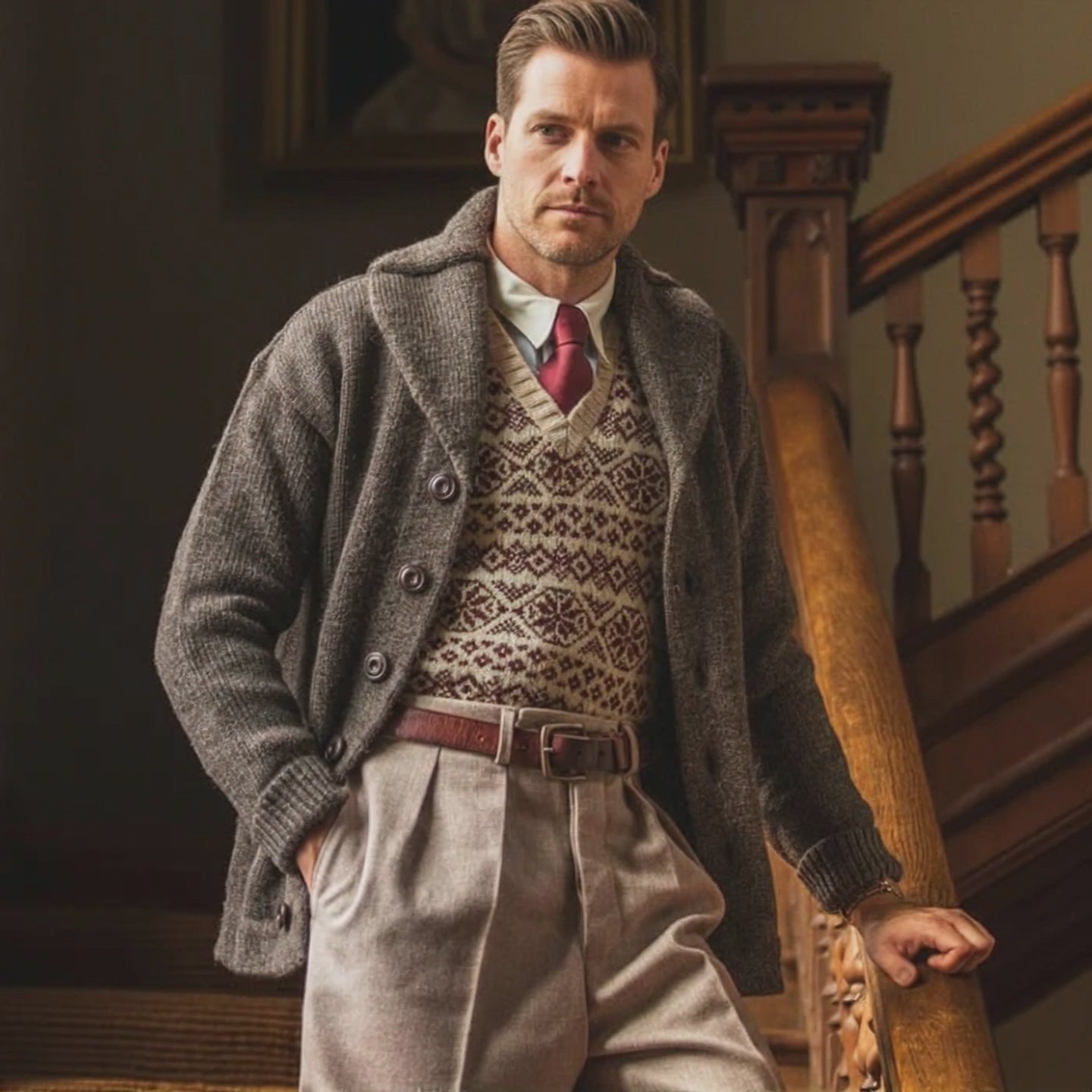This cardigan can be effortlessly paired with a white or cream shirt for an elegant semi-formal outfit. For a more casual look, wear it over a simple tee and combine with jeans or chinos. Finish the ensemble with boots or loafers to enhance the sophisticated appeal.