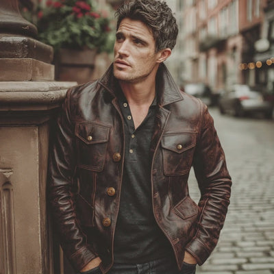 The Men's Classic Reddish-brown Distressed Button PU Leather Jacket is an exquisite addition to any wardrobe. This jacket is designed to combine classic style with modern sensibilities, offering a robust and fashionable look. Its reddish-brown hue and distressed texture give it a vintage appeal that’s perfect for any casual or semi-formal occasion.