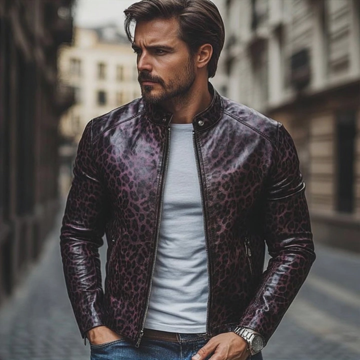 The Men's Fashion Leopard Print Stand Collar Zipper Slim Fit Leather Jacket is a bold and stylish piece designed for fashion-forward individuals. Combining the timeless appeal of leather with a striking leopard print pattern, this jacket offers a unique, edgy look that makes a statement. Perfect for those who want to stand out, it blends modern design with high-quality materials for an effortlessly chic and comfortable style.