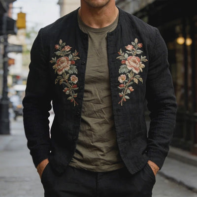 The Men's Retro Casual Cotton Linen Embroidered Collarless Button Jacket is the perfect fusion of retro style and modern design, providing versatility and elegance. Whether your aim is to dress up a simple outfit or add a distinctive piece to your collection, this jacket stands out as an essential piece for fashion-forward individuals.
