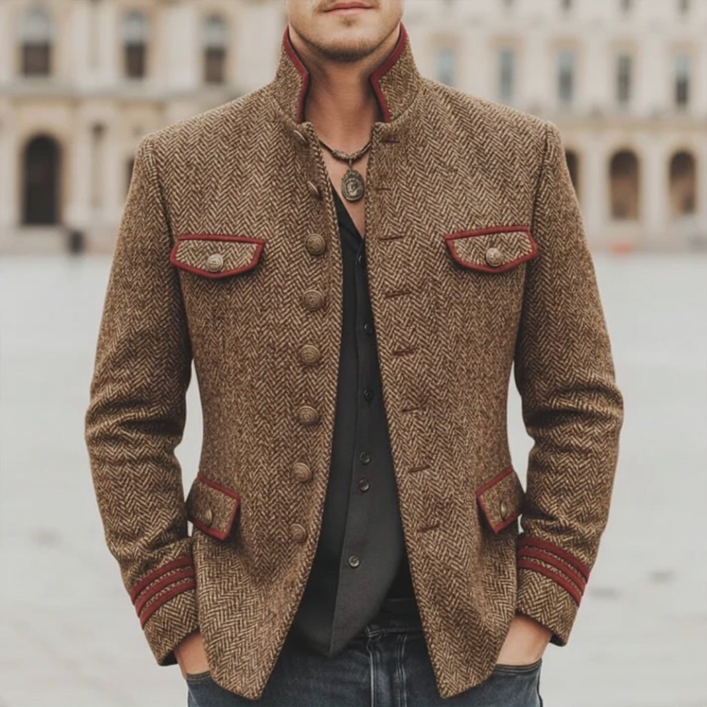 Men's Retro Stand Collar Multi-Button Herringbone Faux Wool Jacket MTA1419K1U