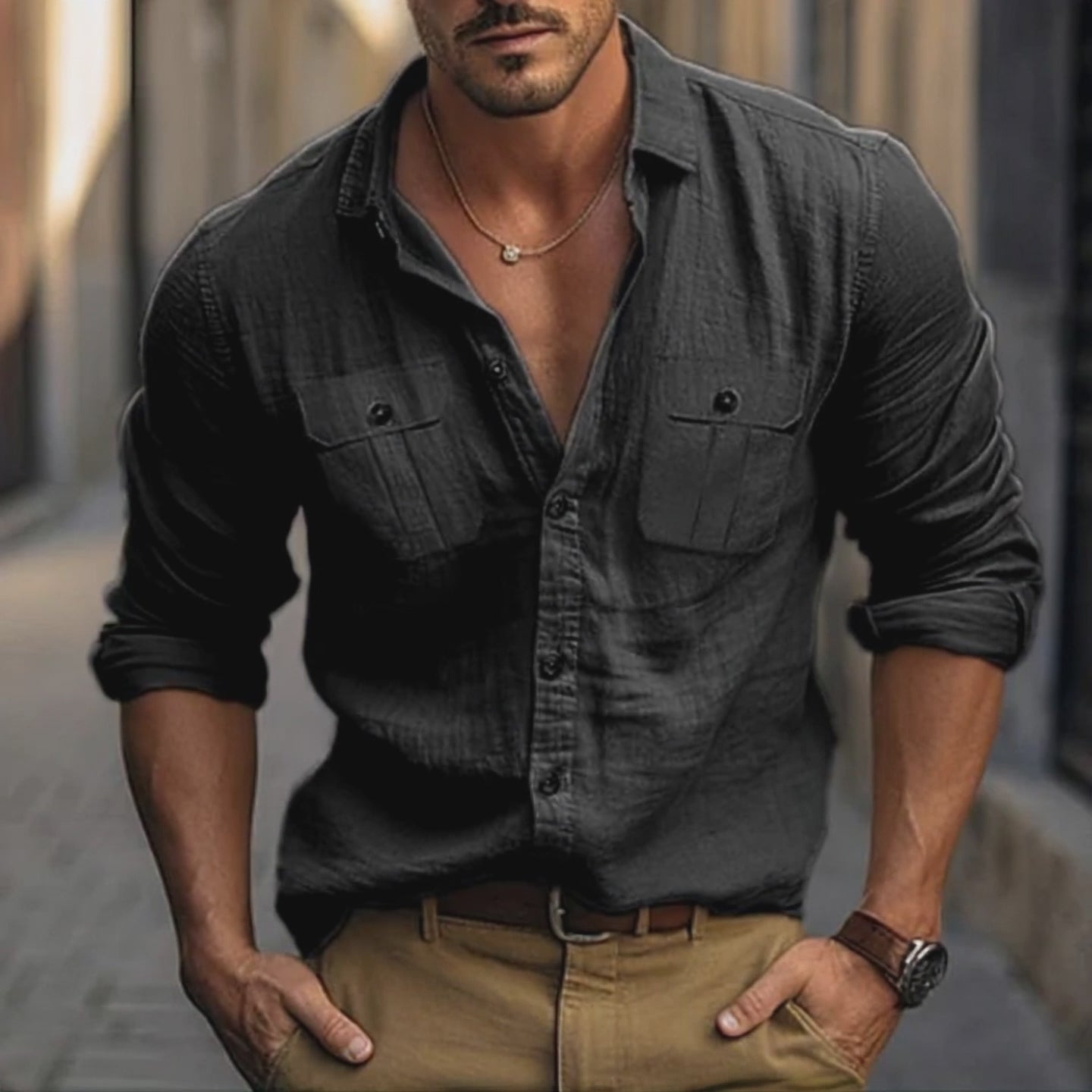 Elevate your wardrobe with our Men's Solid Color Double Pocket Cotton and Linen Long Sleeve Shirt, offering timeless style and comfort for any occasion.