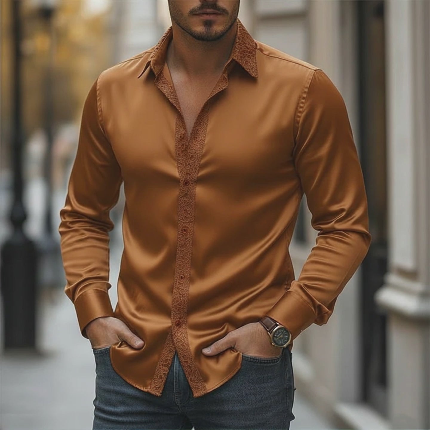 This vintage-inspired long-sleeved shirt for men combines delicate lace and luxurious satin fabric, offering a unique and elegant look for the spring season. Designed with attention to detail, this shirt is a perfect blend of classic style and modern sophistication.